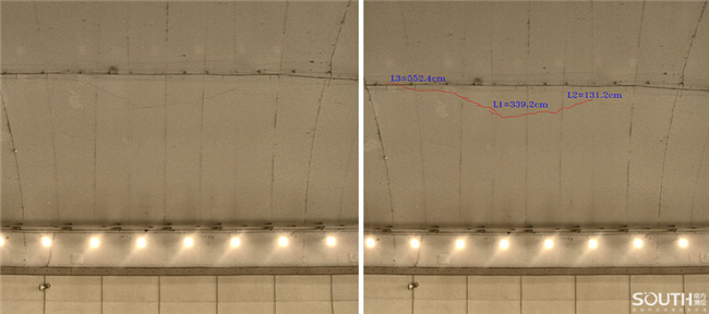 该项目的检测数据为基础的成果数据,施工后需要作为再次检测病害信息对比的依据。结合系统内的里程计参数对应隧道内的栅格影像信息,系统采集到的高清影像能够明确病害位置,并在图像拼接过程中保证数据的真实性和可靠性。系统能够根据隧道断面图得出相机至隧道顶部的距离,通过距离分析像素单元距离,从而得出裂缝病害长度,并将检测采集隧道基本信息、病害数据以及影像资料等形成隧道信息大数据,为隧道运营安全提供坚实的数据保障。