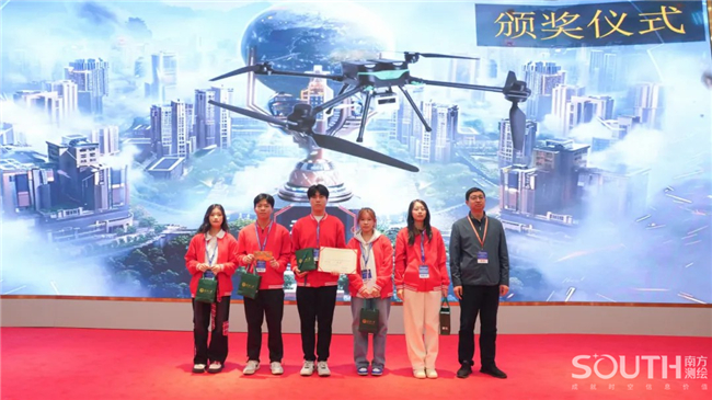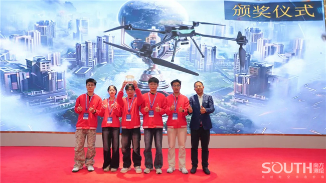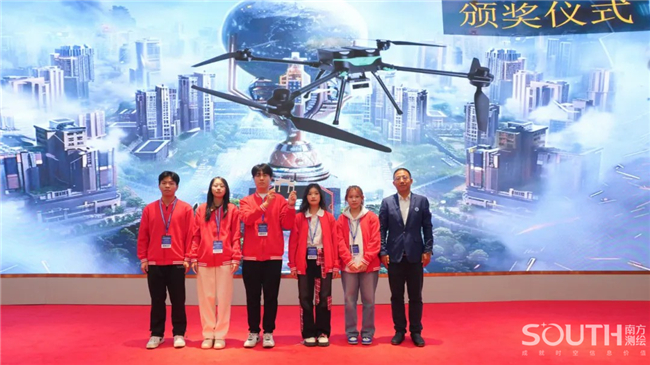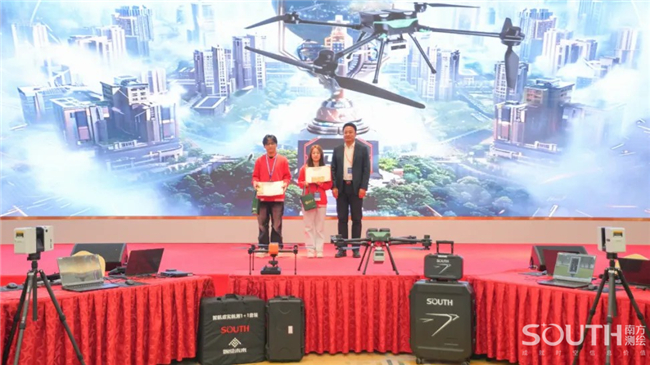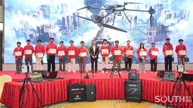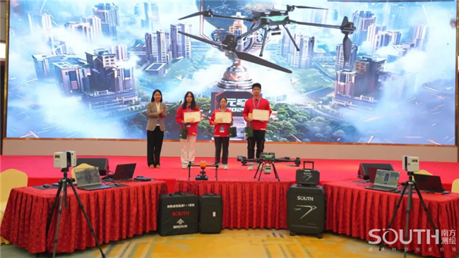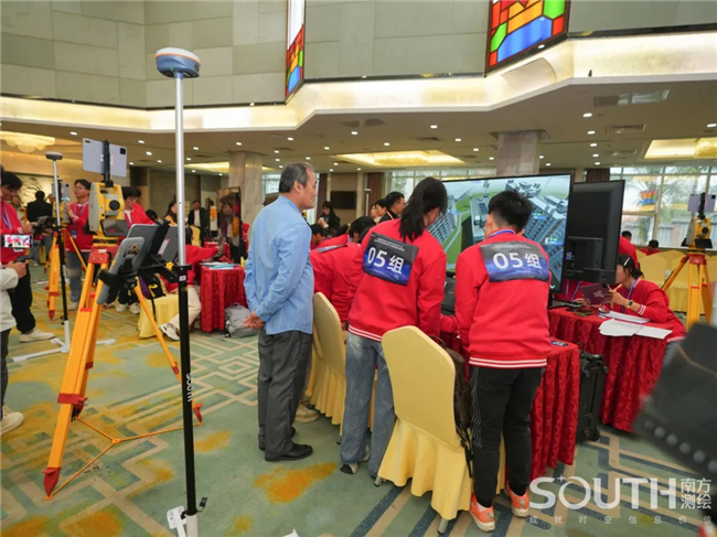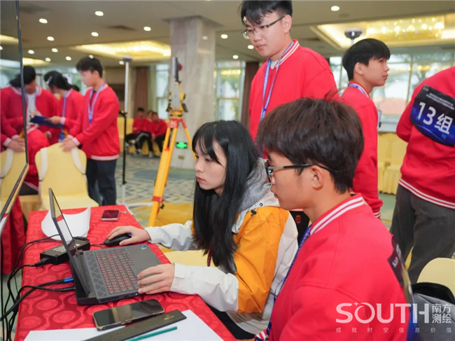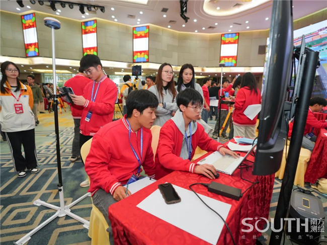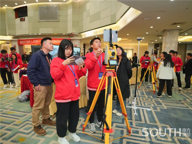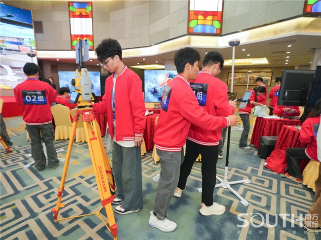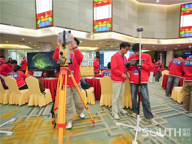 展演现场,百名参赛选手五五成队,进入“南方元宇宙智能测绘场景”,共同完成目标测区的数字测图。赛场上,选手们有条不紊,沉着应对,团队协同作业,1人操作全站仪、1人精准架设棱镜、1人使用RTK、1人绘制现场草图记录关键数据、1人负责内业阶段的成图工作,整个团队共同完成测区的任务。