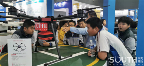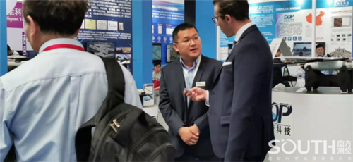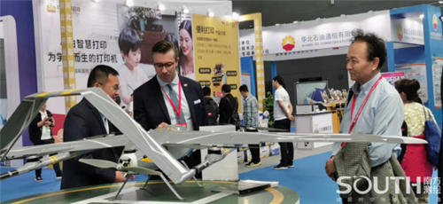 工作人员向国际友人交流介绍南方天巡MF-2500无人机