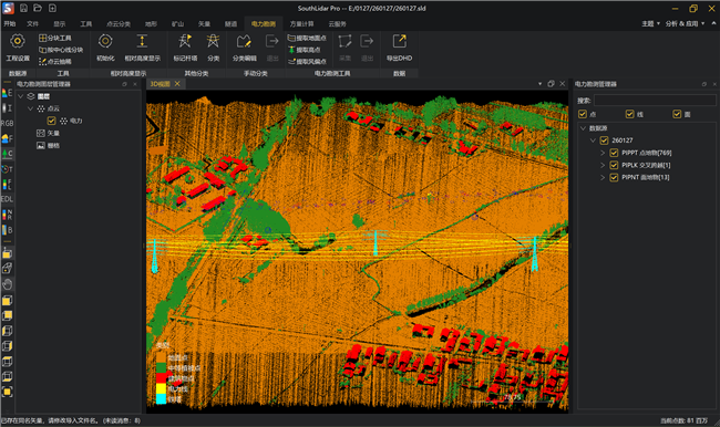 标配南方SouthLidar Pro激光点云综合处理软件,具备从多源数据接入到行业成果输出的全链条处理能力 ——可高效实现机载移动测量系统数据智能化预处理,输出生成高质量彩色点云成果;也包含激光点云数据处理模块和应用分析模块如点云分类、电力勘测、DEM等高线生成等。