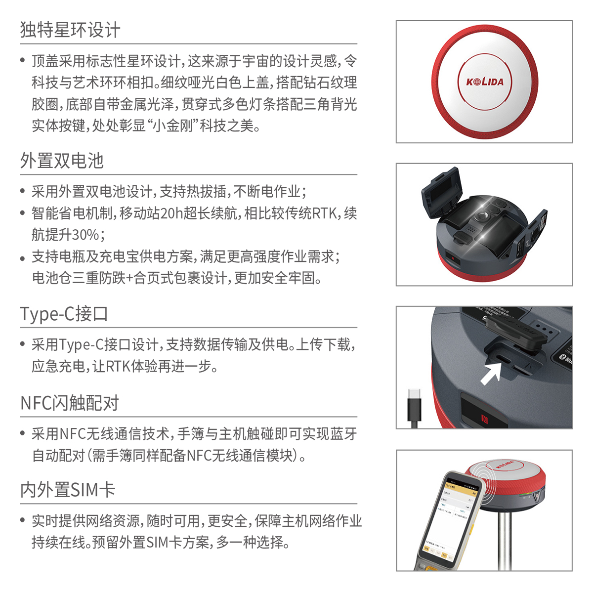 NFC无线通信 | 采用NFC无线通信技术,手簿与主机触碰即可实现蓝牙自动配对(需手簿同样配备NFC无线通信模块) |