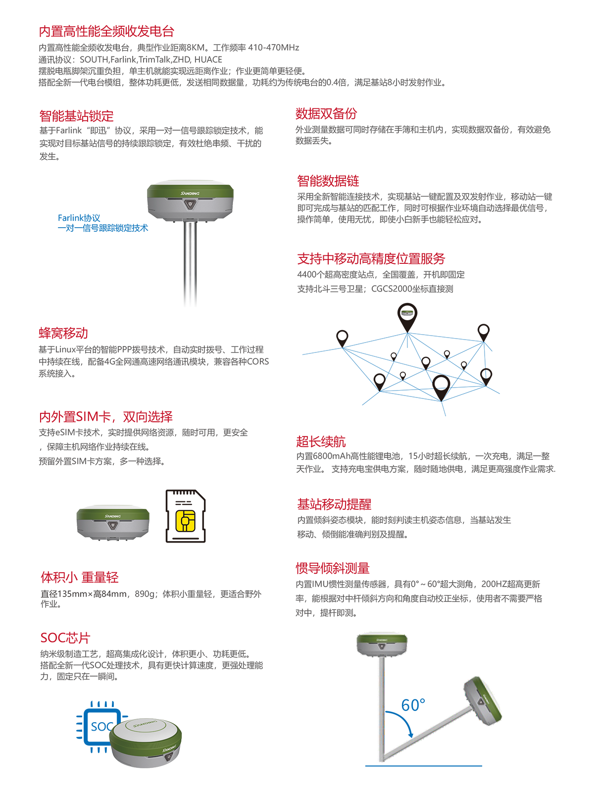 4G全网通 | 基于Linux平台的智能PPP拨号技术,自动实时拨号,工作过程中持续在线,配备4G全网通高速网络通讯模块,兼容各种CORS系统接入 |