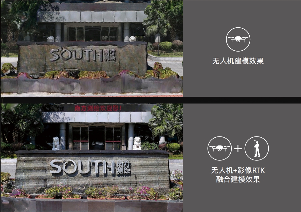 无人机航测时,对于屋檐、树下等视觉盲区,会出现拍摄不到或者影像拉花的问题,使得整个模型不完整。可以使用影像RTK沿着无人机视觉盲区进行动态拍摄,实现无人机数据与影像RTK数据联合精细化建模。