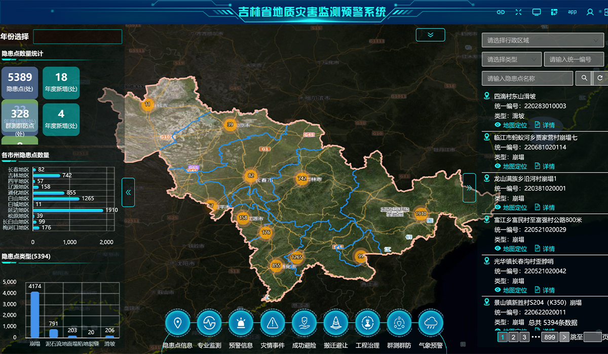 1、结合省级地灾业务逻辑:实现从地灾一张图到专业监测及应急指挥的业务流程,含成功避险、搬迁避让、工程治理、群策群防等业务功能。